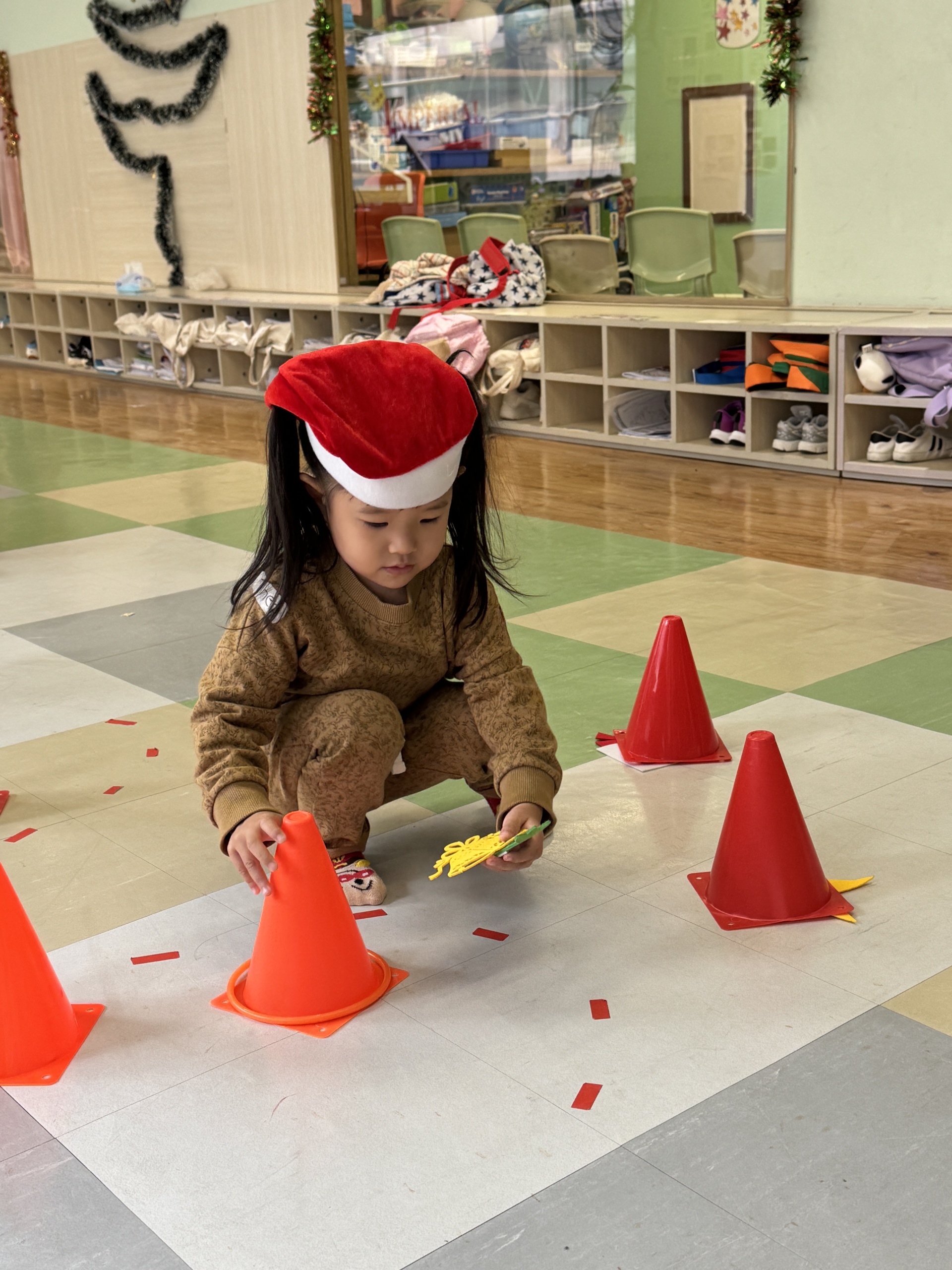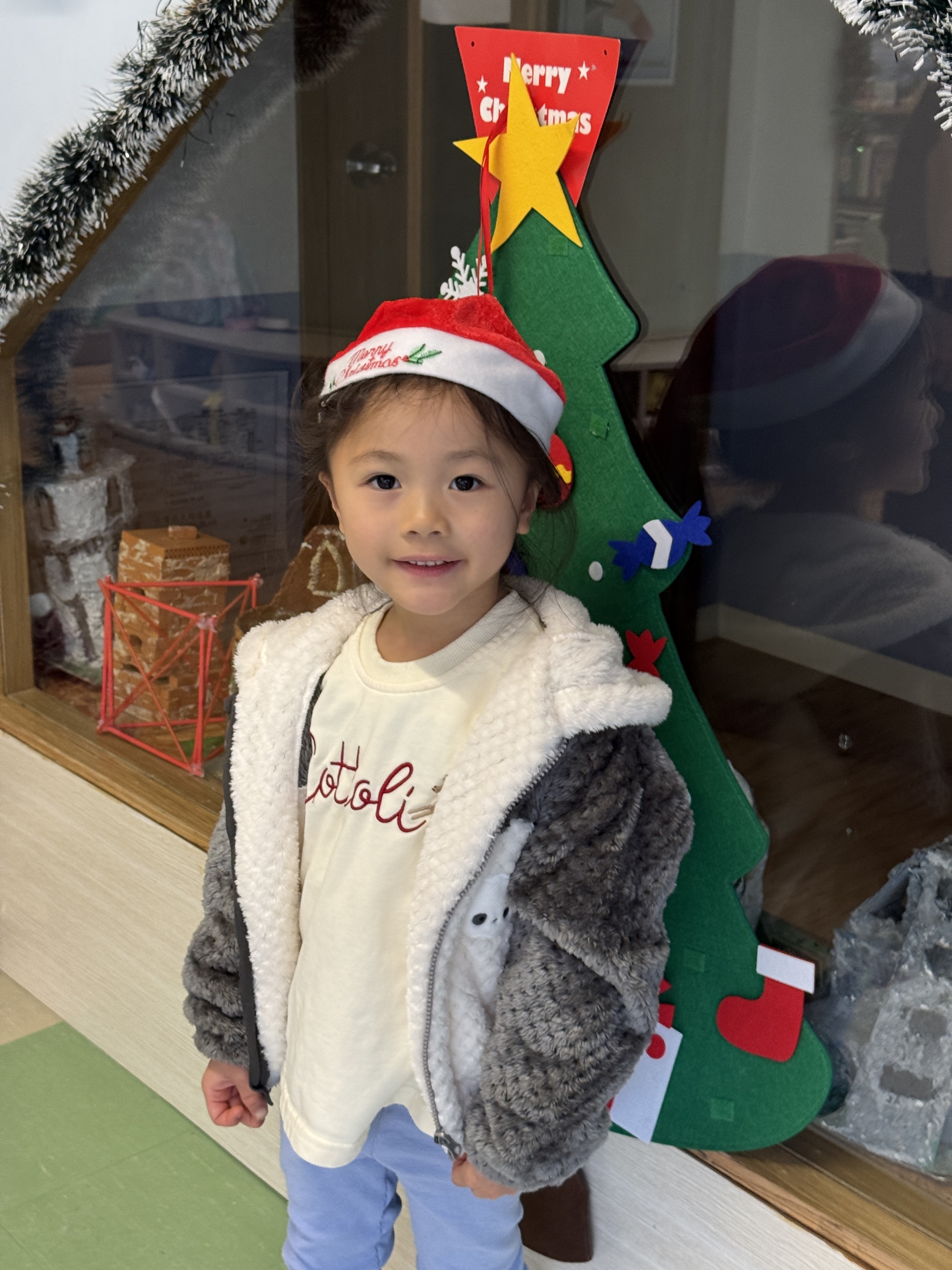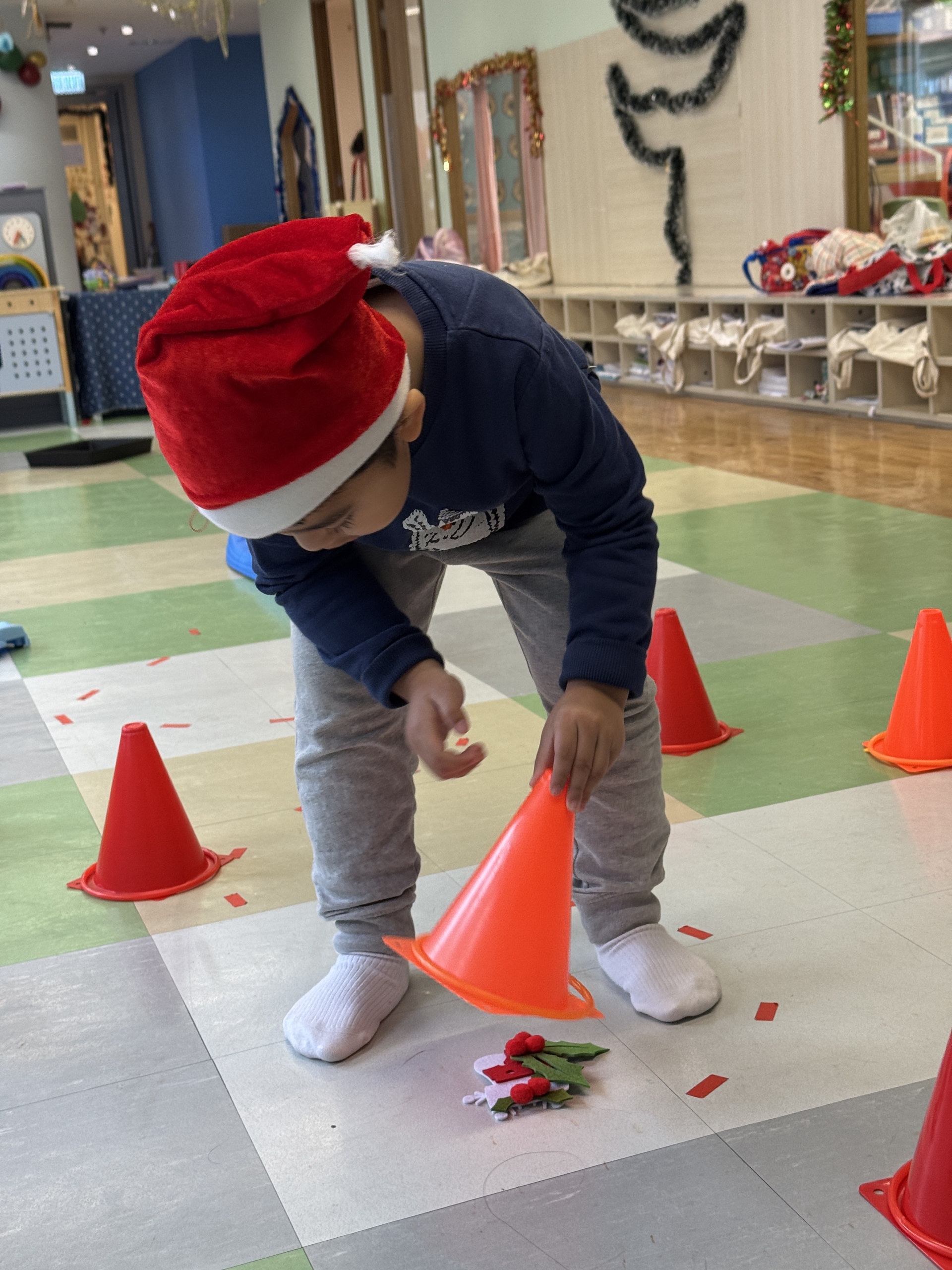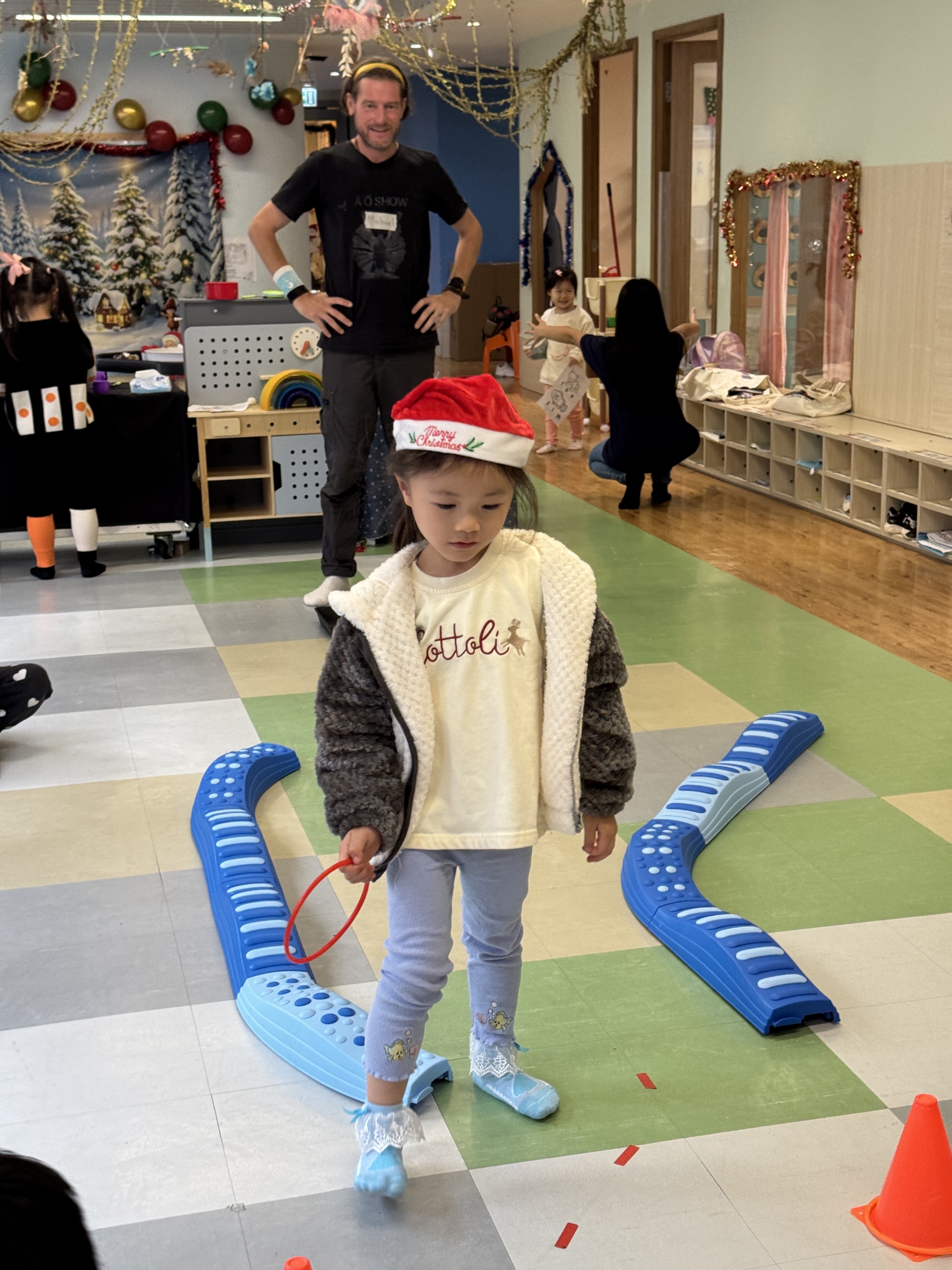 Today we crafted our own Santa Claus with our hands, laughed and ran to the rhythm in a group game of musical hula hoops, and lit up our very own Christmas tree with sparkly decorations.