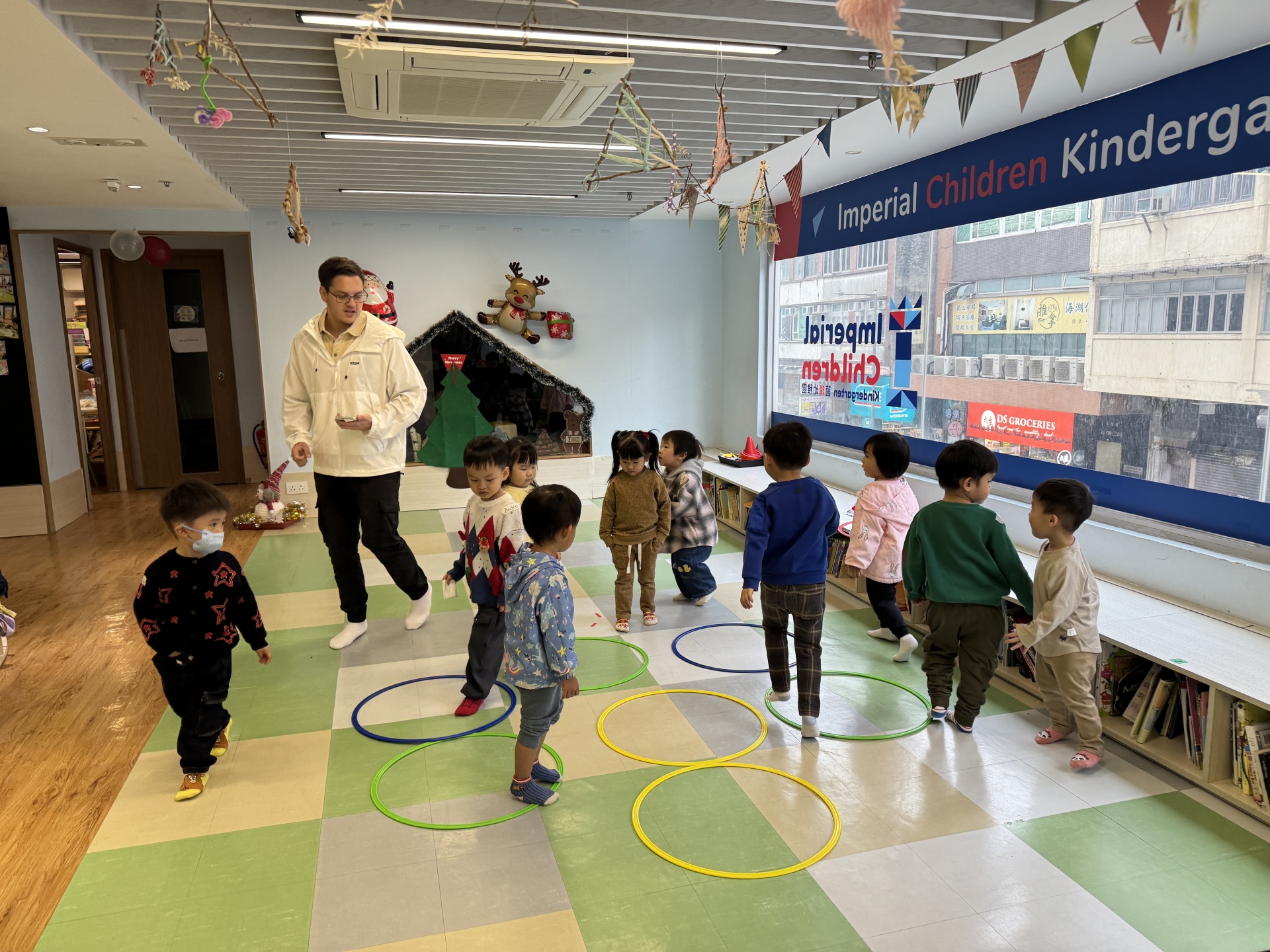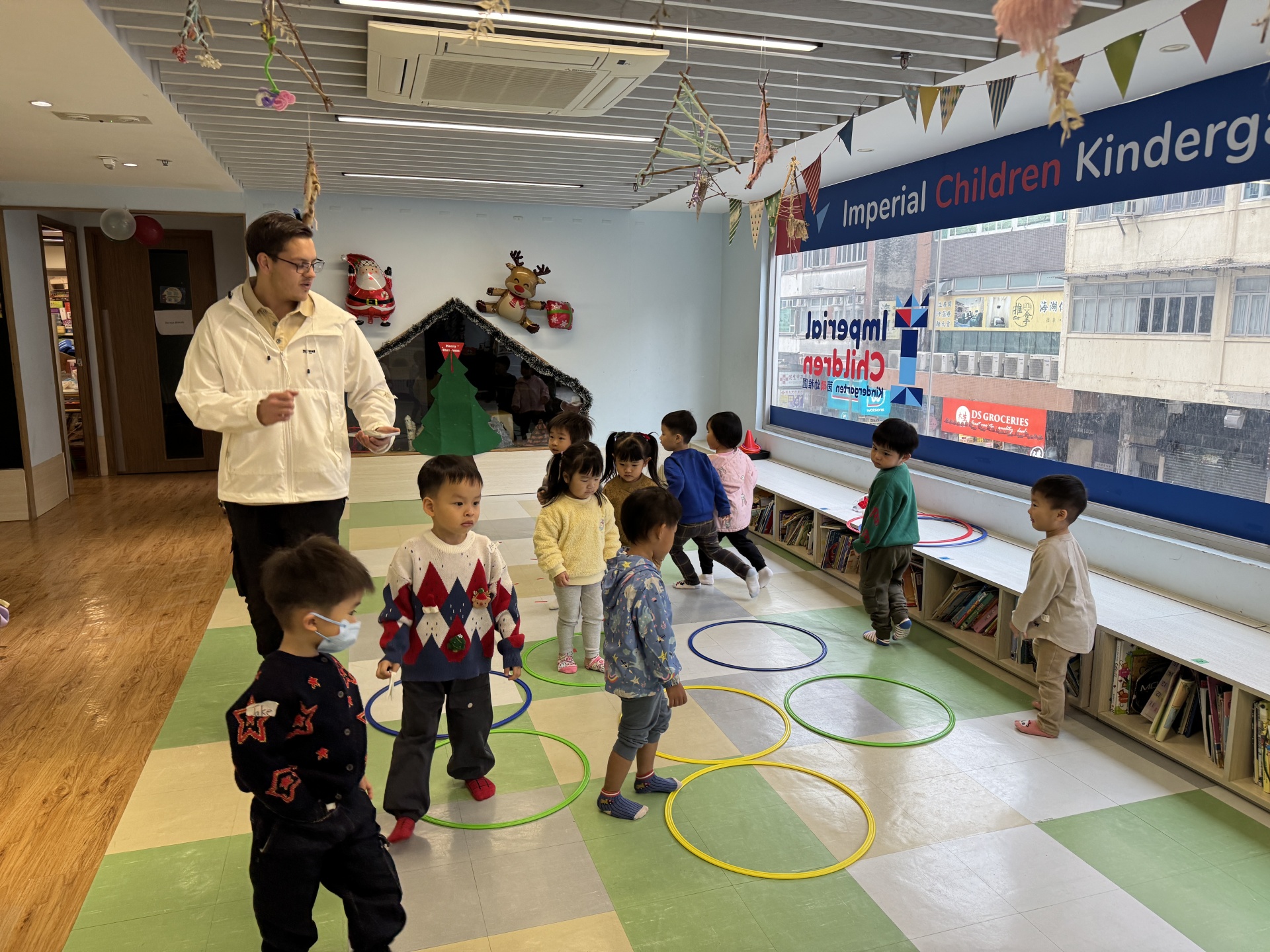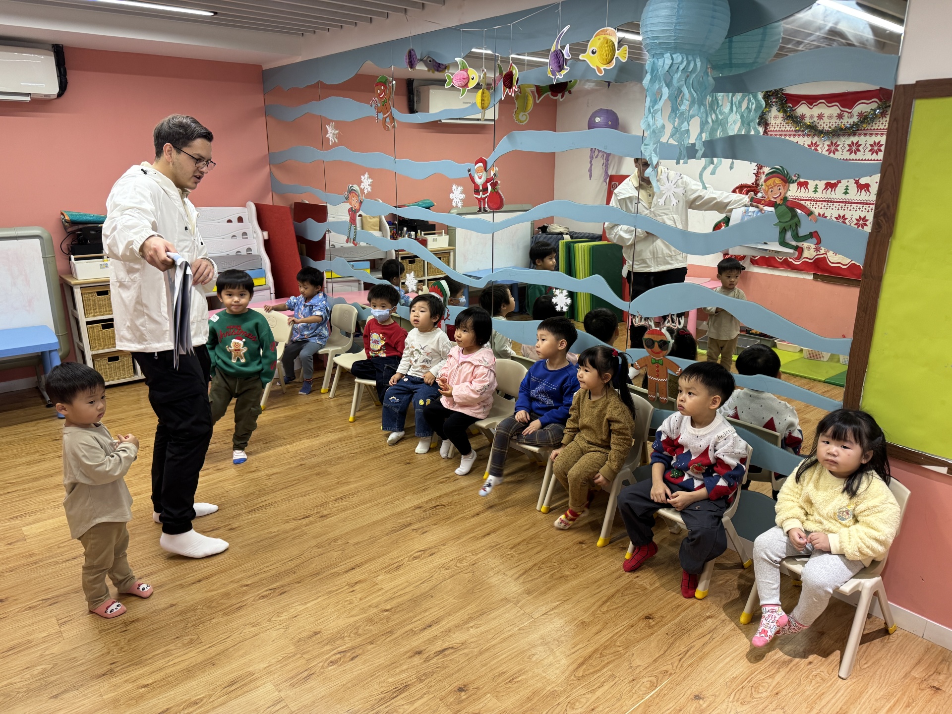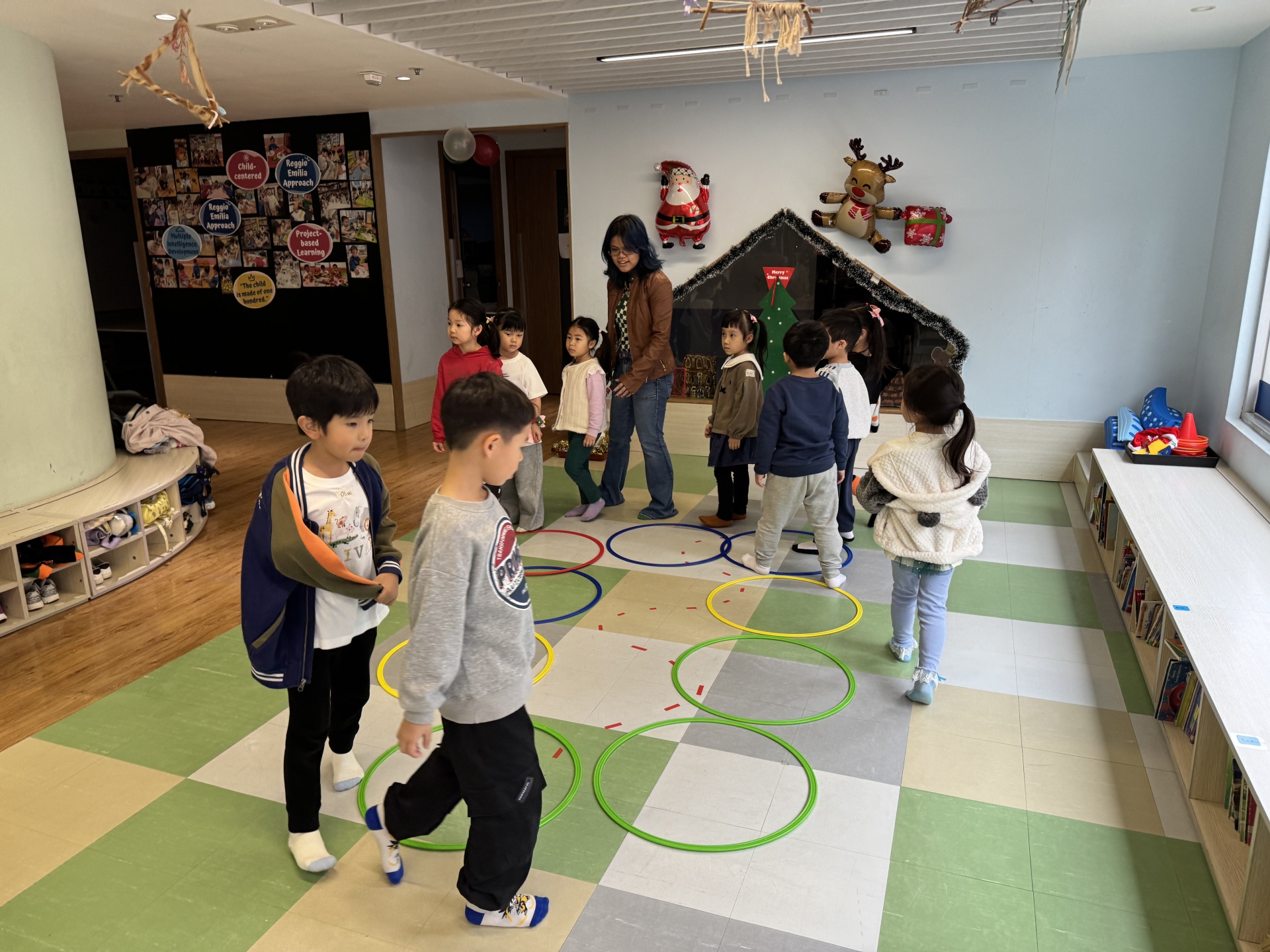 Today we crafted our own Santa Claus with our hands, laughed and ran to the rhythm in a group game of musical hula hoops, and lit up our very own Christmas tree with sparkly decorations.